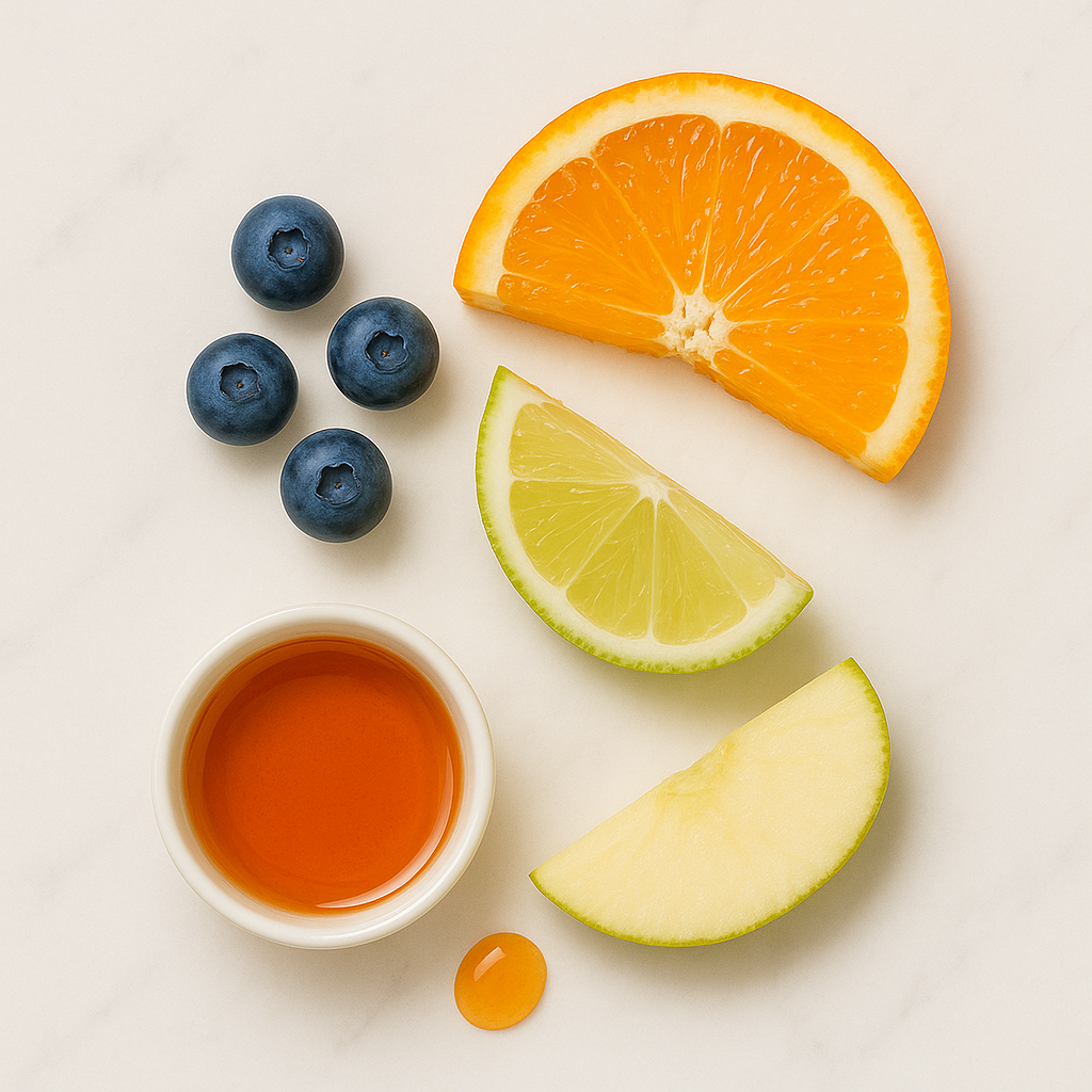reguliuoja pH, eksfolijuoja odą ir ją šviesina.